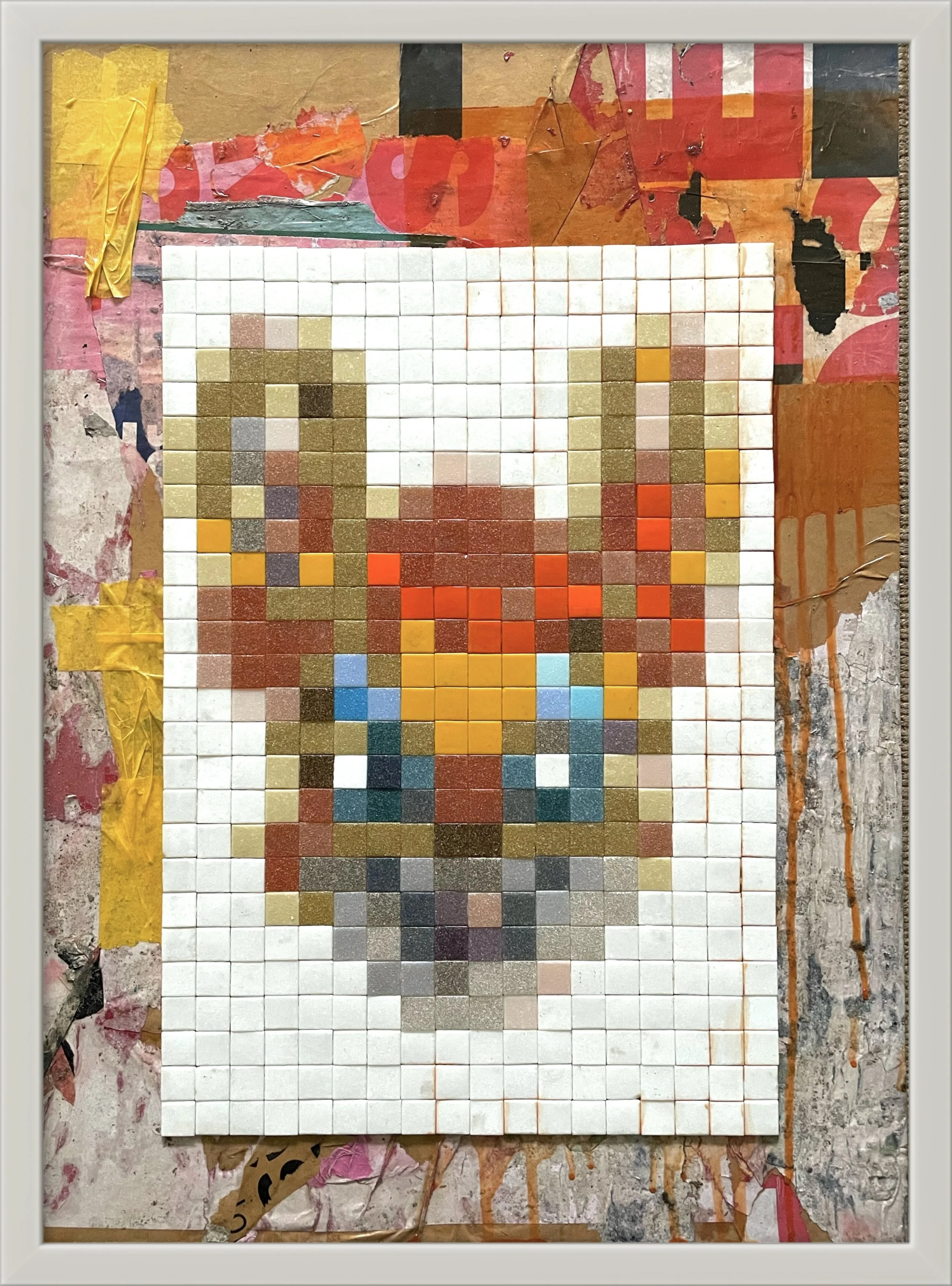 A pixelated mosaic of a vintage children’s mask, emerging from a worn grid layered over torn street posters and urban residue. Innocence and decay collide, sealed with an epoxy resin finish.